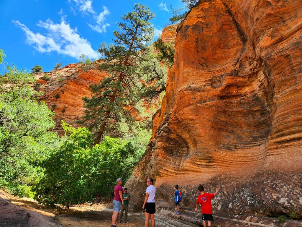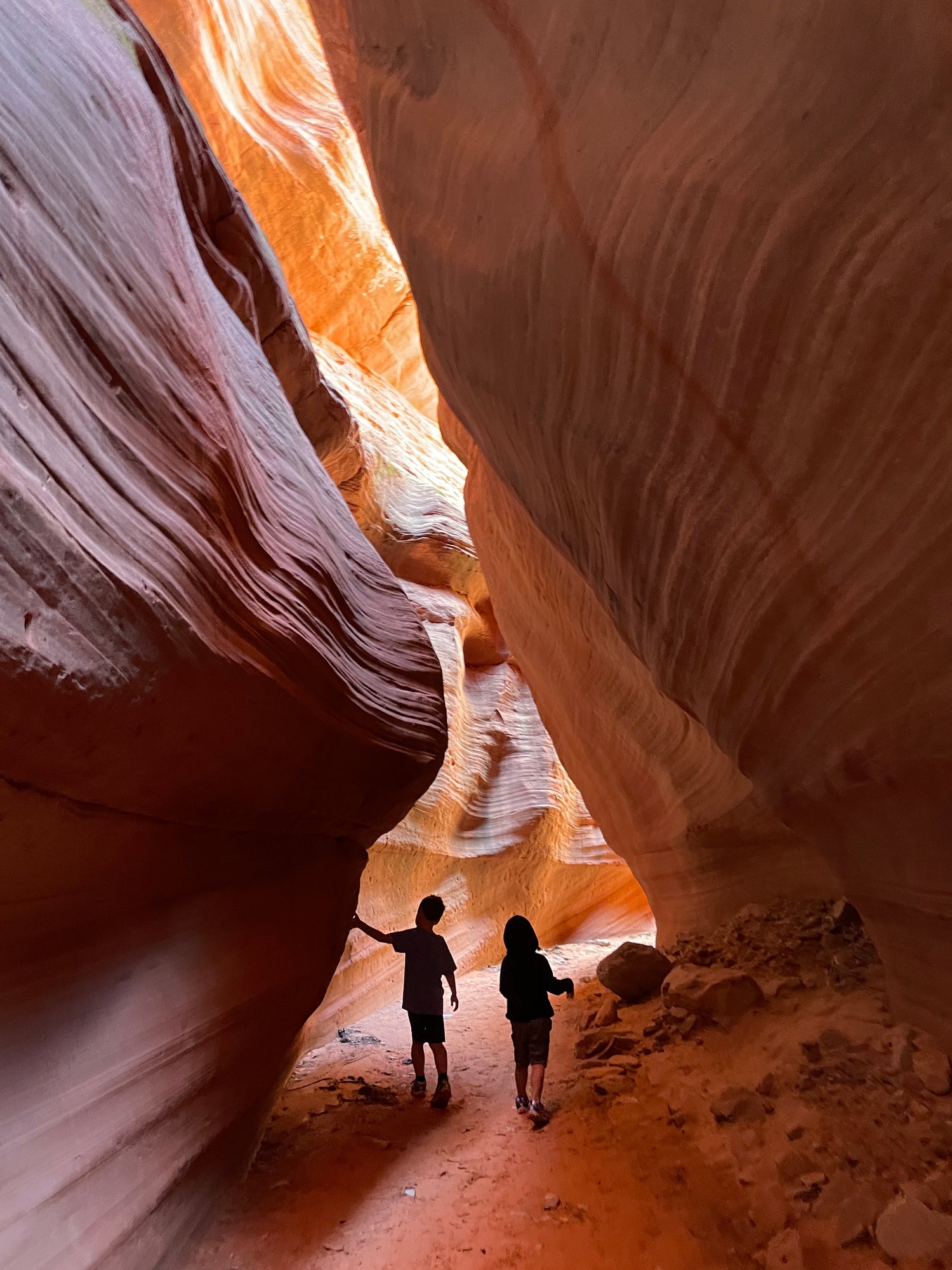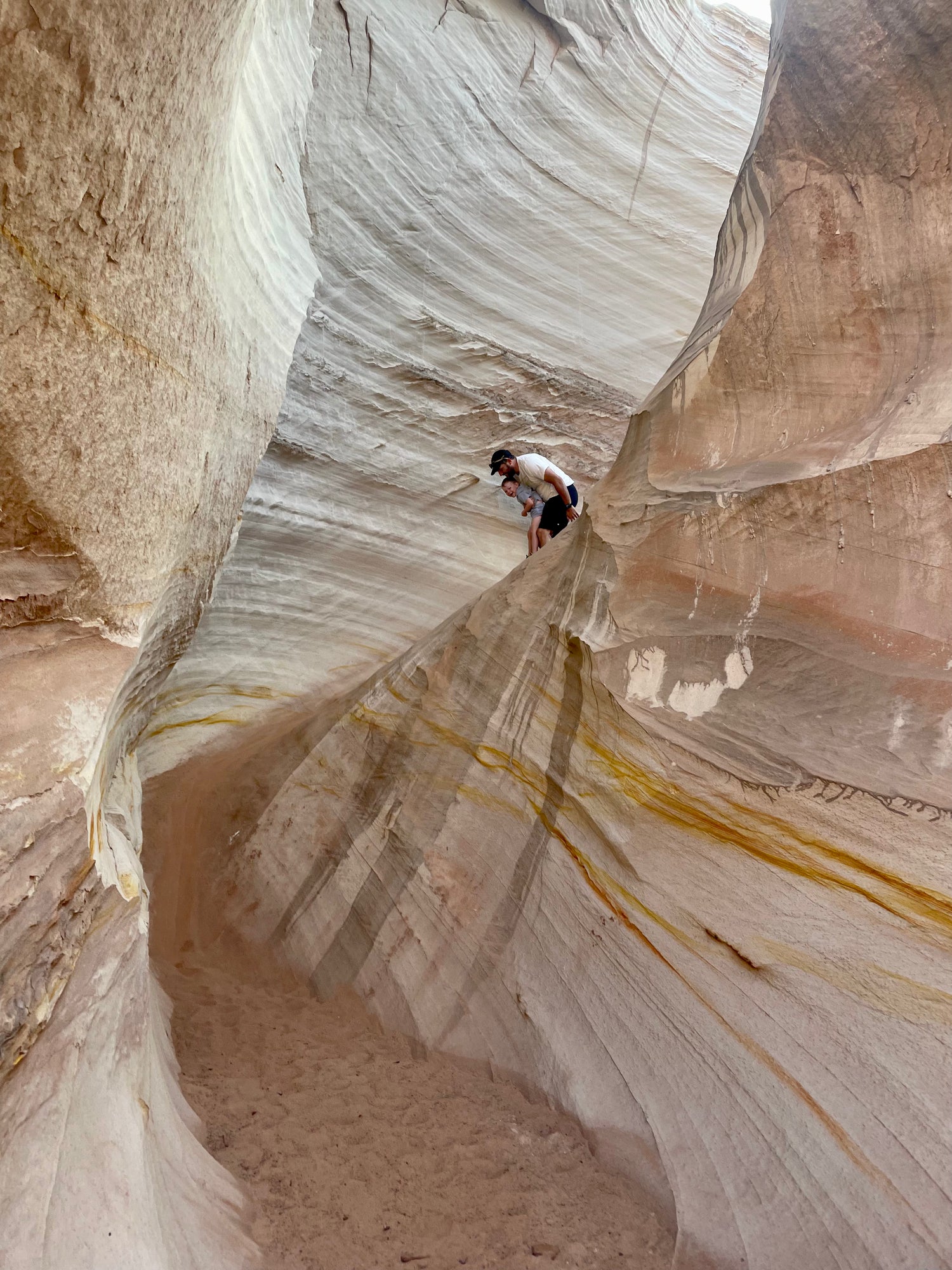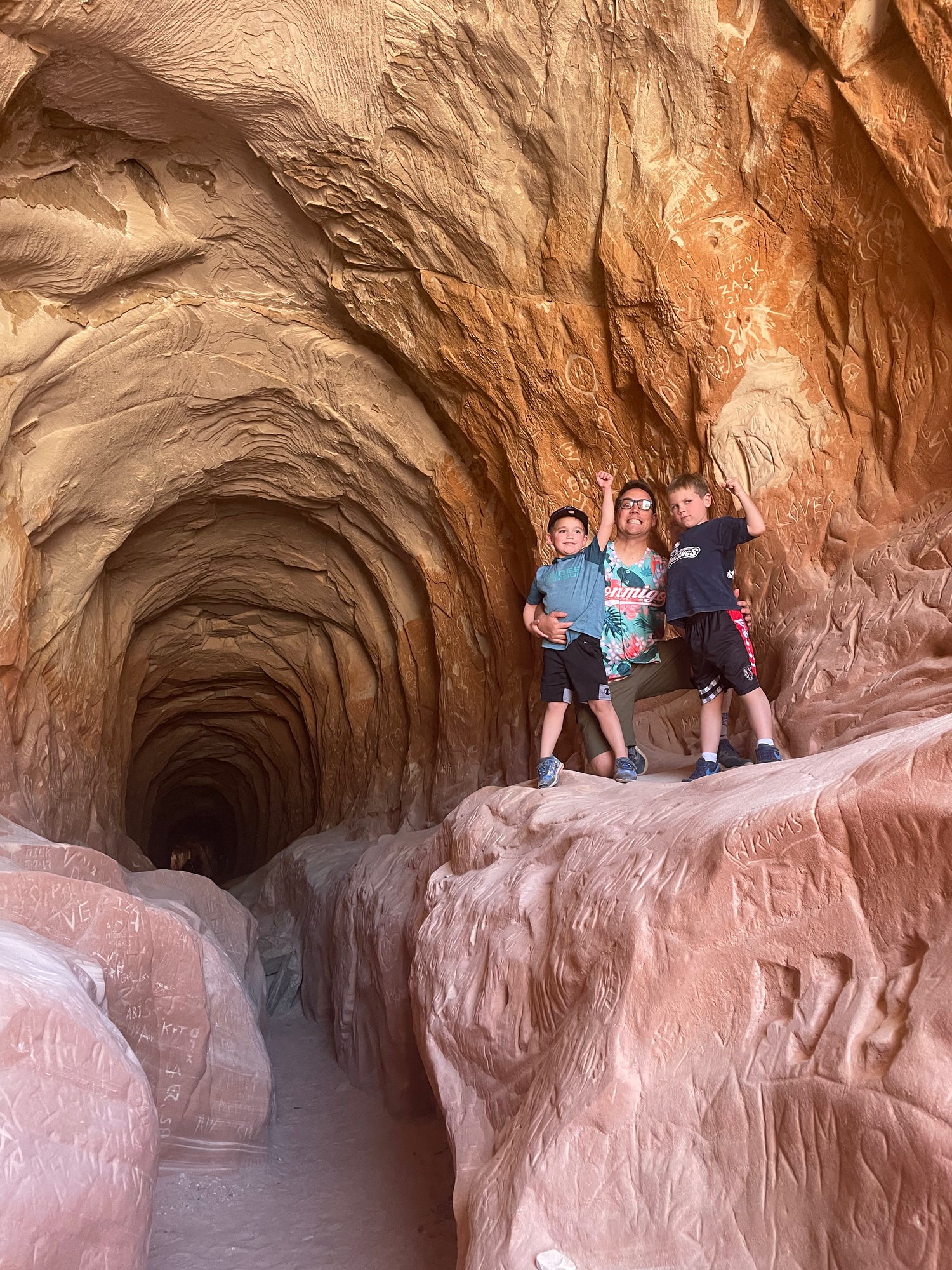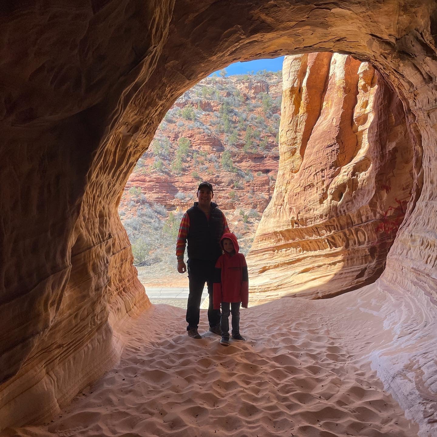 If you are coming from the North, you will drive right by some sand caves that are visible from the main road coming into Kanab. It is a steep hike up some rocks, but small kids can do it with supervision. It only takes about 30 minutes round trip depending on how long you stay in the caves.